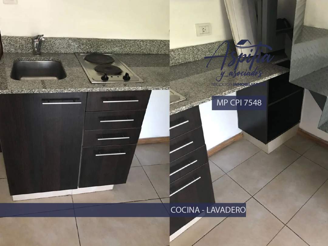 • Planta baja: estar comedor con salida a balcón y cocina integrada con bajo mesada, alacena, espacio para heladera y conexión para lavarropas.