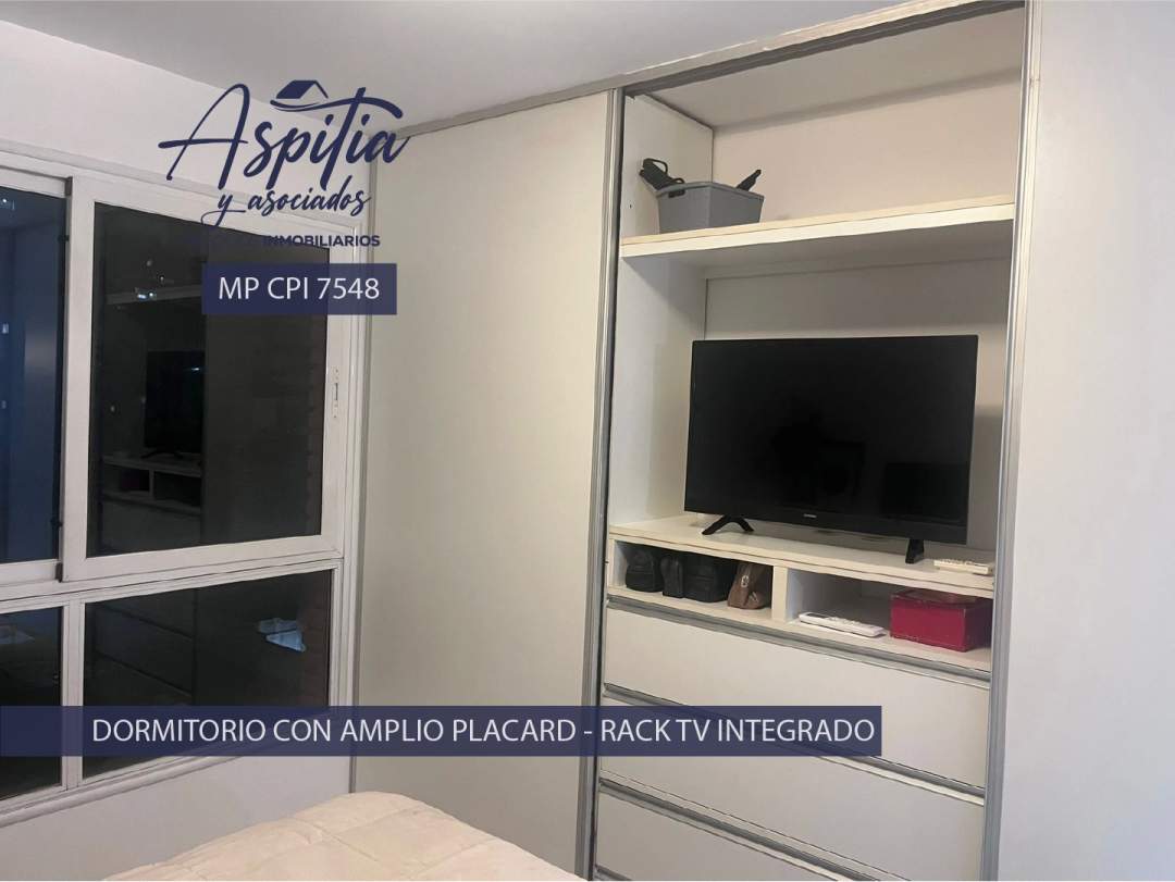 En el dormitorio, la misma lógica se mantiene: orden visual, amplitud y soluciones inteligentes. El placard de pared a pared integra el rack de TV, liberando espacio y aportando diseño. El aire acondicionado completa un ambiente confortable en todas las estaciones.